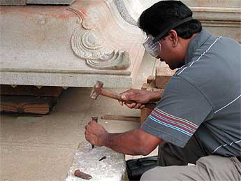 The tedious work of fitting the "sun shade" (edge of the temple roof) onto the edge of the chinna gopuram, continues.