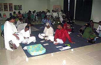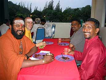 A few more workshops followed and then dinner was served. Youth leader Aravind Raj and Sivaneswaren having dinner with swami and yogi.