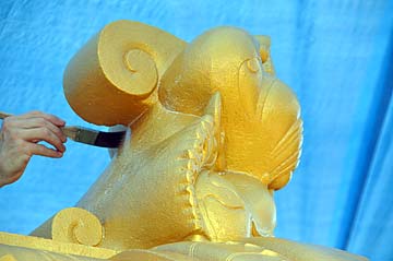 The work begins with the Rajagopuram. Sizing... a kind of special varnish, is applied.