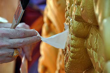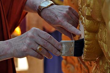 He applies the first piece of gold.