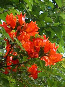 The African tulip tree has brilliant orange-red flowers.