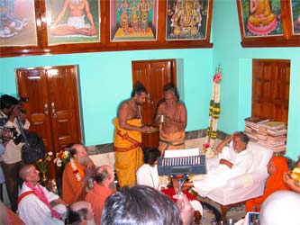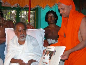 Next the group adjourns to the main audience hall and Trichyswami is brought over from his private quarters by his monks.