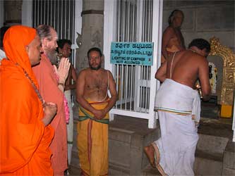 With mighty drumming and nadaswaran, the innersearchers are all taken to the temple for arati and darshan of Goddess Rajarajeswari.