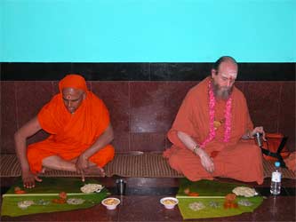 Jayendrapuriswami and Bodhinatha eat together.