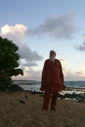 Gurudeva on the beach in Kapaa town. He came here daily for many years to work on his books.