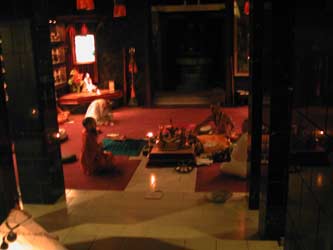 This is Sun One on our panchagam at Kauai Aadheenam, and the day always begins with early morning homa, or fire worship, in Kadavul Temple. This view is looking out from the inner sanctum, with the crystal Siva Lingam just in the picture at lower left.