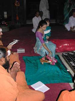 Vasuki Sendan and daughter Shaila place flowers upon Bodhinatha's sandals. The guru's sandals are used to represent his presence.