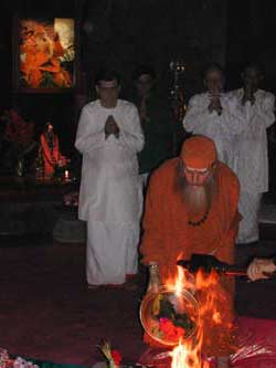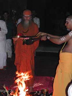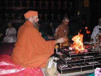 Paramacharya Ceyonswami burns the devotees' written prayers in the homa fire.