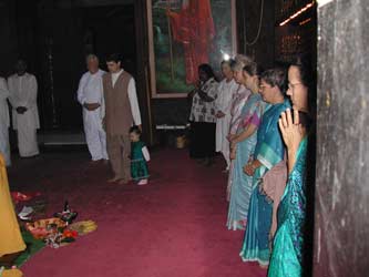 Mrs. Sayuchchiyadevan is seen at the end of the line of ladies on the left side of the temple, while little Shaila stands with her father, Jothi Sendan.