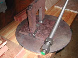 These substantial pieces of steel are the lifting mechanism for the vimanam cap stone. The rod is 1 1/4 inch steel, the hook 1 inch plate and the round disc 1/2 inch. There is a hole in the top of the cap stone for this mechanism. The large disc goes underneath, inside the capstone, the hook on top, connected by the rod and multiple bolts. In a few days the crane operator will hook this up and do a trial lift, which includes weighing the capstone. There are estimates of the weight, but it is difficult to be precise with its unusual shape. Knowing the true weight will assure that the right capacity crane is used.