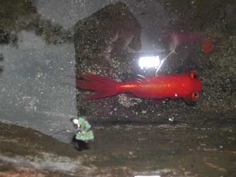 This is the newest addition to our fish pond. It has eyes on top of its head, and is therefore the first of our fish to actually see its picture being taken. We're not quite sure what it made of the flash.