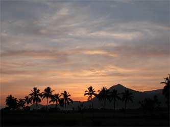 Acharya Kumarswami, view the villagers, trees and mountains in the early morning sun.