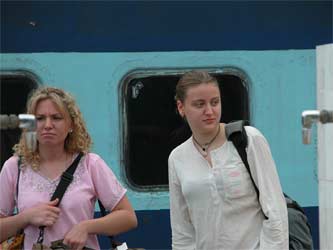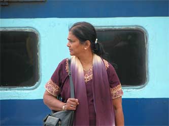 In blue on the left is Mrs. Sivayogam from UK. She knew Yogaswami when she was a little girl and her husband was named after Yogaswami. The ladies are happy to finally get off the cramped train.