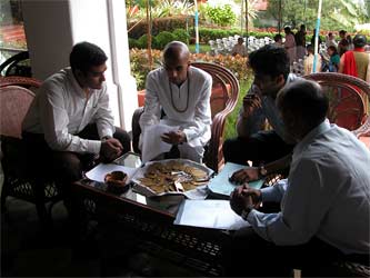 Sadhaka Dandapani meets with the two staff with our travel agency that are handling all the ground logistics., from buses to hotel reservations and checking in. Everything is taken care of in such a transparent way, that the Innersearchers are entirely freed from all these travel concerns.