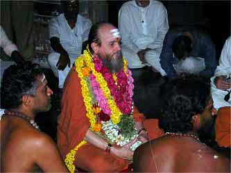 The next day we attended a grand puja at Brihadeeswarar Temple in Thanjavur. The innersearch group arrived at the temple at 8:30 and didn't leave until 1:30. It was a typical homa and abhishekam, however the scale of it was huge. In addition to the five priests at the homa and blessings the 108 Kumbhas, there were an additional ten priests chanting from Sri Rudram. After the opening portion we went to the sanctum for abhishekam for the Maha Lingam, which is thirteen feet high. The Lingam is so tall it has a permanent scaffolding installed to allow the priests to pour on the top of the Lingam. Gallons of milk, chandam and other sacred substances were carefully poured over the Lingam. We then went back to the homa area for the purnavati to conclude the homa, paraded the two major kumbhas around the temple and then all 108 blessed kumbhas were poured over the lingam while the vyoma vyapine chant was done. After a break during which the Lingam was decorated, we returned. The decorations were stunning. The entire lingam base and the bottom half of the lingam were covered with flowers that consisted of alternating stripes of white yellow and green. A large yellow and red garland went over the top. Quite a lot of flowers in all. Then the usual puja commenced of dhupa, deepa, naivedhyam, alankara and so forth. The alankara was the largest we have ever seen, visible from quite a distance. It was an inwardly powerful experience for sure. Om Namasivaya.