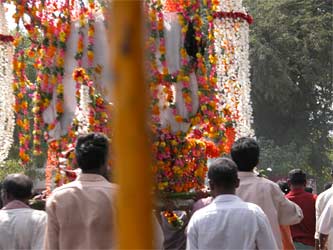 Giant garlands adorn a chariot moving through the streets.