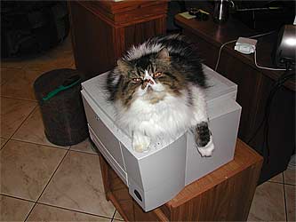 Ganapu cat is a big fluffy aloof sort of fellow. Though a little attention from any one of the pet humans is acceptable, he really doesn't really like his pet humans to pick him up... both feet on the ground, that's his philosophy. But he loves to follow his No 1 pet human, Paramacharya Ceyonswami, around and even attends the morning puja in the temple if Ceyonswami is on vigil. Back at the Lambodara Kulam office, it's a bit chilly today and this laser printer is a nice and warm place for a nap. Sure you can take my photo, he says, just don't bother me.