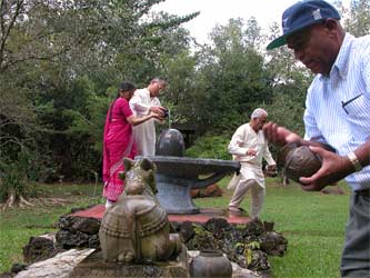 Bathing the lingam with his wife: Sharma and Nishtala from Houston, Texas. they came just to see the Mahasphatika Siva Lingam at Kadavul temple.