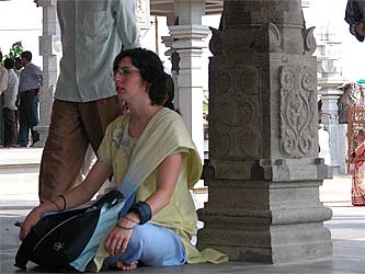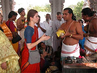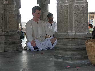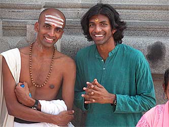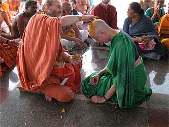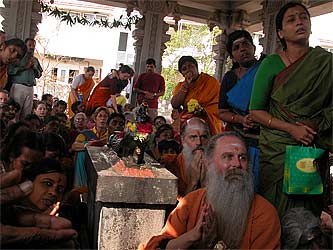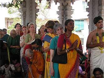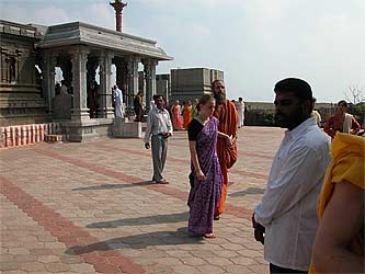 More photos from the last day of Innersearch. Here is Bodhinatha at the Arupadai Veedu temple. Valli has taken a very traditional form of personal purification that is done for the grace and blessings of Lord Muruga and shaved her head. Bodhinatha blesses her with Sandal paste.