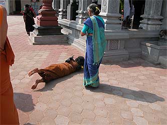 One lady is doing rolling penance, "rounding" the temple by rolling. Yogaswami once performed this penance himself, covering himself with chilis peppers and rolling around, on the burning hot sands, at the great Murugan temple of Nallur, Jaffna, Sri Lanka.