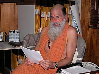 Sannyasin Natarajnathaswami reviewing some articles he has done and printed out.