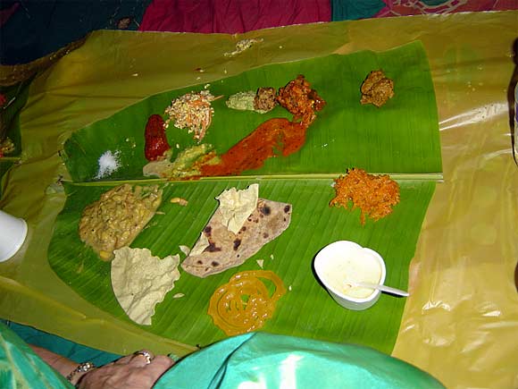 A typical plate of rice and curry, served just so, with each item in its properly assigned placed on the banana leaf. Small portions. Good, you're thinking, naively, "Oh gee, finally, a light lunch!"