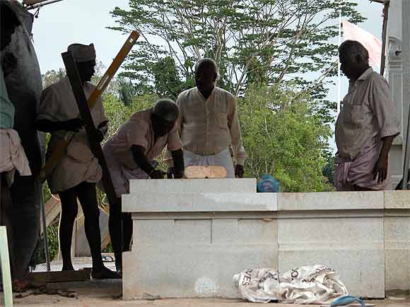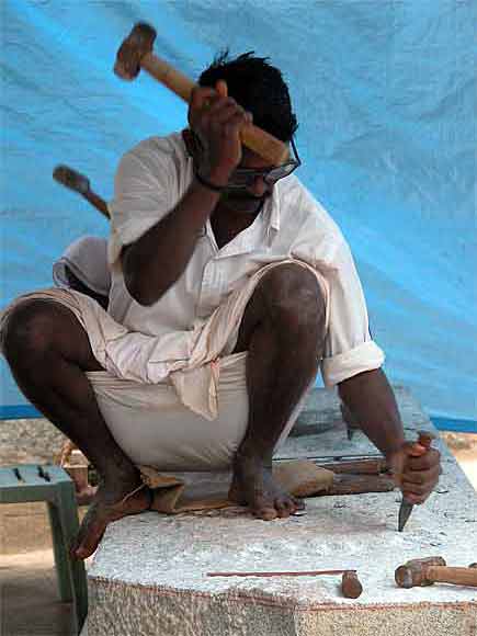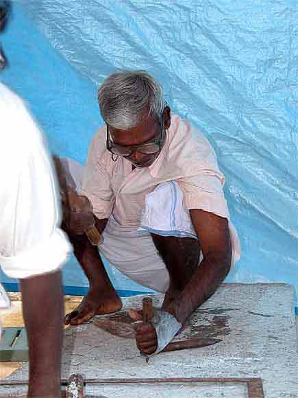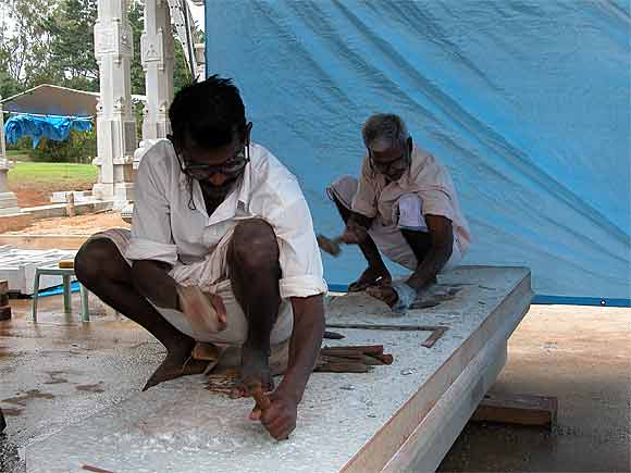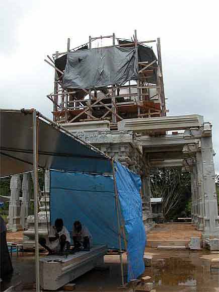 The silpis at work on the base of the East side Chinna Gopuram of Iraivan.