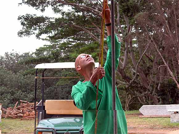 Sadhaka Adinatha working on a quicktent covering some stones. Our Siddhidata Kulam team is ever busy providing the back up support and logistics management for the Iraivan Temple project.