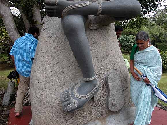Mrs. Sivamani walks around the giant murthi...