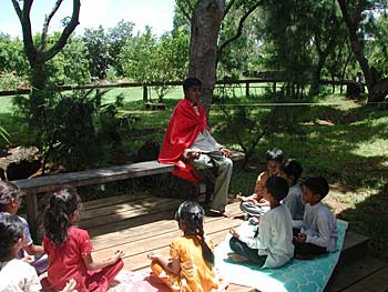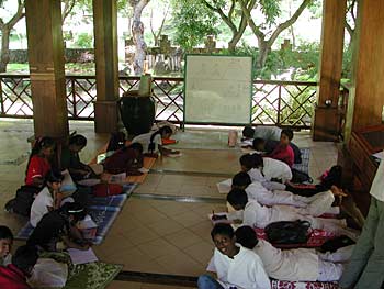 This is a role play going on from one of the Lessons of Book Two of the Master Course Saivite Hindu Religion. The lesson is on the importance and role of the Satguru in someone's life. One student, wearing a red shawl is playing the role of the Sat Guru while others are quietly listening to his words of wisdom....