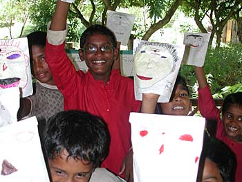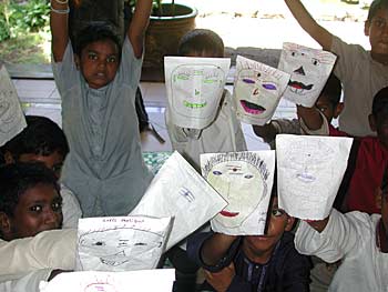 Each student was given a paper bag and was asked to draw one's physical body on it.. some drawings look fancy and funny.... the children are happy and are learning serious things too. Then they carefully place their hand inside the bag and make it move.... real Muppet show. The hand represents the soul. Without the soul the physical body is nothing. The soul never dies and is a body of light.... You can play this game with your kids too at home. It's simple and easy. Why not try it at breakfast table? You will be teaching them a wonderful lesson about their true nature as explained in Book Two.