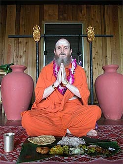 Bodhinatha seated for lunch at the Aadheenam. Today was the second day of the phase, when the Ekadanta Kulam shares news of its activities. It's just a team of two, Talaivar Sannyasin Saravananathaswami and Sadhaka Dandapani. Swami said he had been working with communications to some young men interested in monastic life, make arrangements for Bodhinatha's travel, proofreading Hinduism Today and newly designed documents for initiations for new sishya, and communications with the Tavil and Nadasvaram players in Toronto, to make arrangements for them to come to Kauai Aadheenam. Sadhaka Dandapani has been working on Innersearch follow up and has prepared a DVD with over 2000 photos for each of the Innersearchers which we will be sending out to them soon.