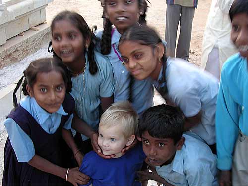Here we are at the temple carving site in Bangalore, these little children, daughters and sons of the silpis are completely enthralled with the blond baby from America. Matthew Reese, was of course, pleased with all the love and attention from people a little closer to his size.... 😉