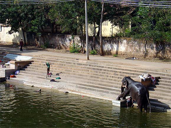 Mahout an his elephant take their morning bath.