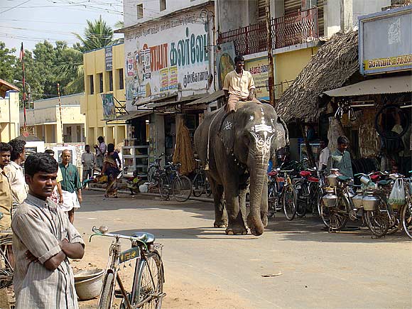 In another town, the temple elephant makes it's traditional rounds of the streets of the town. He (or she) blesses each of the shops and homes.