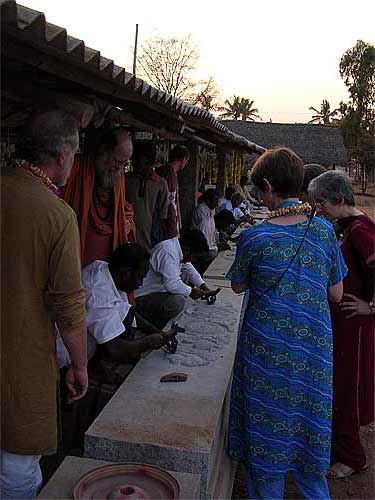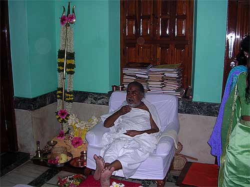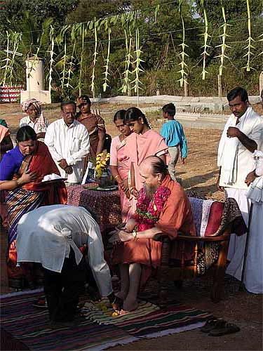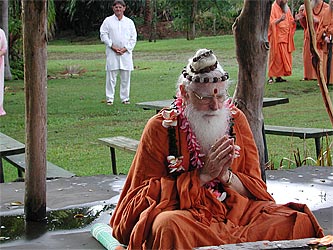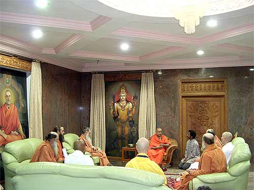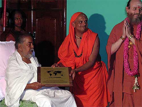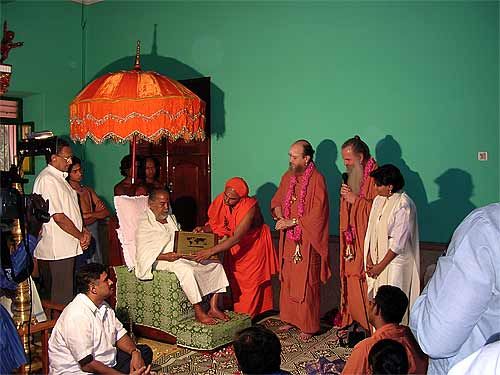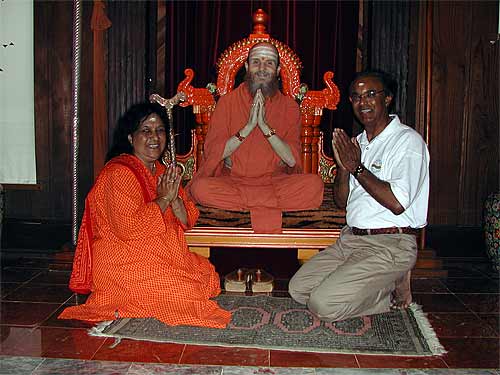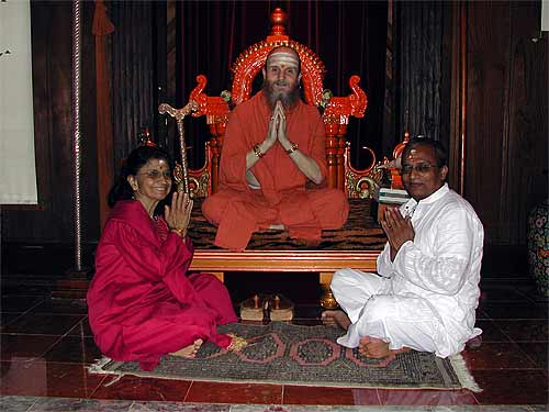 This morning we had the wonderful opportunity of hosting Sadashivanandaswamigal from Tiruvannamalai, India. Though born in the United States of America, he has lived in India as a monk for more than 30 years. Soon after finishing college in America, Swamiji went to Tiruvannamalai in the early 70's. While he was there Bhagawan Ramana Maharishi had blessed him to become a monk in a mystical way. After travelling for a while in India he settled down in Anandamayi Ma's Ashram in Bengal and accepted Ma as his Guru. Soon thereafter receiving Sannyas from a Sankaracharya Swami and was ordained a Sannyasin in the Giri order.
