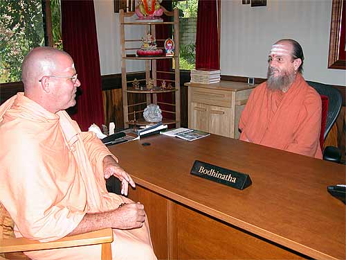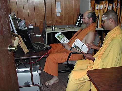 While guests were coming and going our monks are hard at work. Together, the Pilliyar Kulam and Lambodara kulam pull together the San Marga newsletter each month. Sannyasin Shanmuganathswami here downloads addresses from our data base which are merged into the newsletter file.