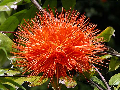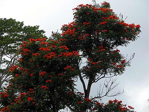 The African Tulip tree that lives down the edge of the pali on the way to the river is tall, majestic and in full bloom. But, beware. Every single seed that falls from these trees will sprout...