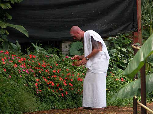Sadhaka Nilakantha picking flowers to take to the temple for the noon Siva puja.