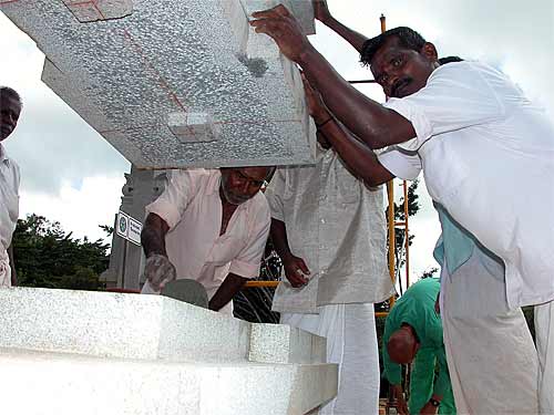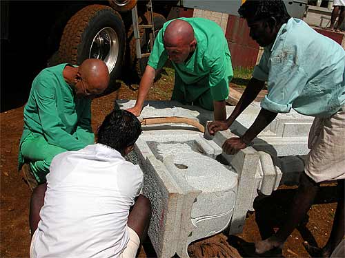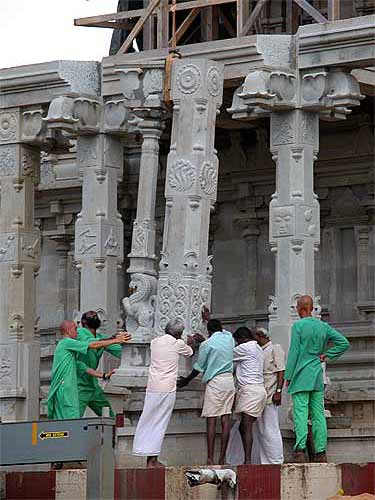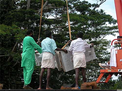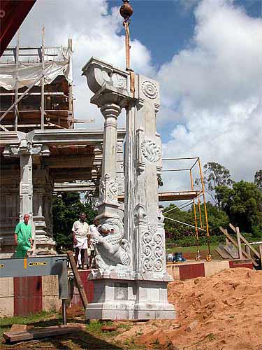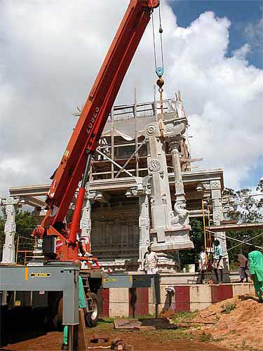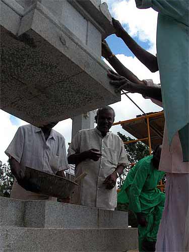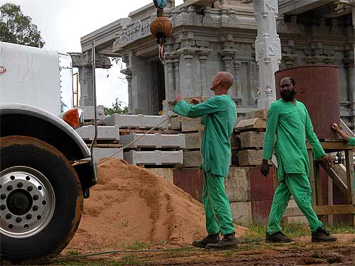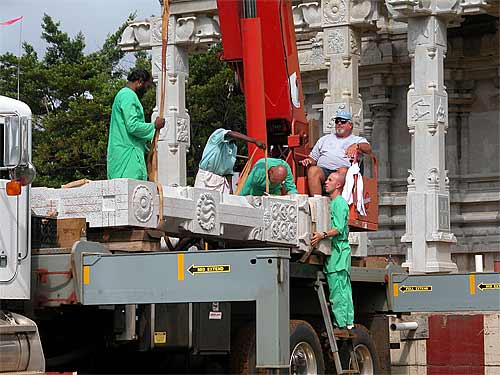 We wonder how they used to do this in India ages ago? Actually, we know. Lifting such a giant pillar would take dozens of men a couple of days, using bars, ropes and pulleys. Now it happens in an hour or less. Iraivan is the first time these builders have had the crane experience, and they continue to be amazed by the efficiency and accuracy of this approach.