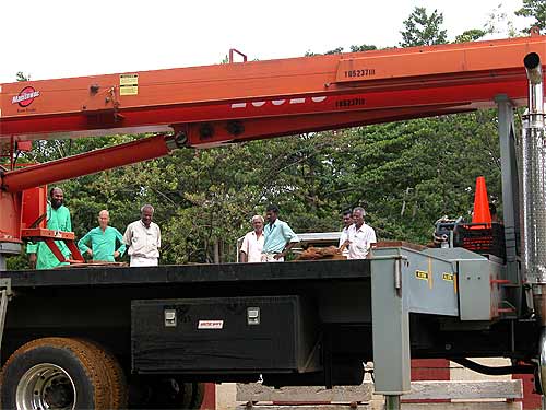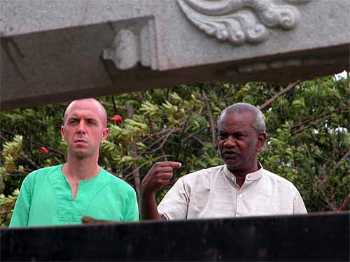 Our master builder guides the crane operations. "A little to the left." Sadhaka Nilakantha is at his side, helping in all ways.