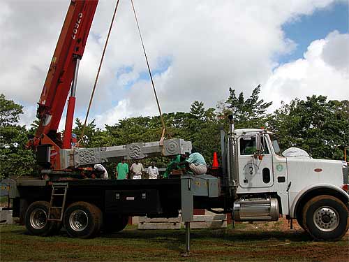 The presence of the second smaller column inside the pillar is cause for extra caution. It took several years to carve each one of these, and we don't want to break anything! So everyone works methodically, or "slow-by-slow" as the Hawaiians say.