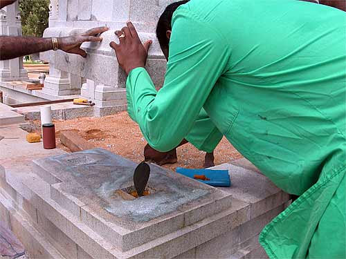 Final touch to the sacred substances... as the pillar comes down...
