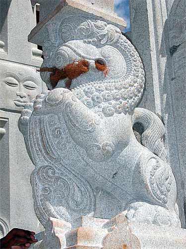 The lions have been carved with a ball inside their mouths, from the same stone, and the ball cannot come out. But, it is loose, so it is packed with coconut husk to keep it from bouncing around during the moves.