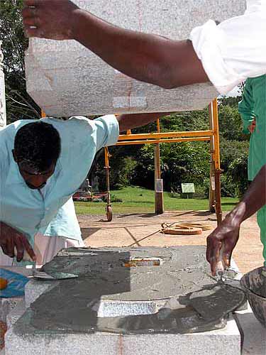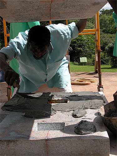 Mortar is hand-mixed to be placed as a thin layer under the pillar.
