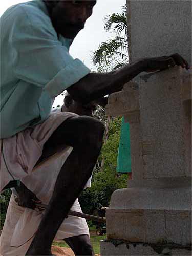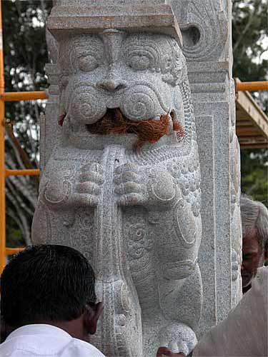 These pillars are very heavy. Once set down, out silpis would not be able to budge them with their bars, even a quarter of an inch... So, with the crane taking the weight, very carefully they are put into place.