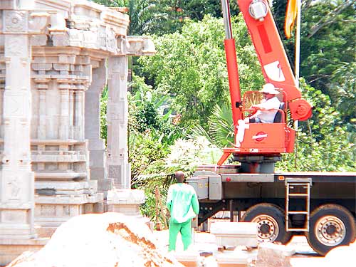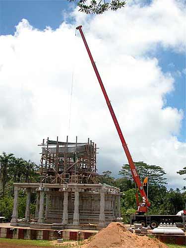 With the pillars set, attention turned to lifting more stones up to the top of the vimanam.