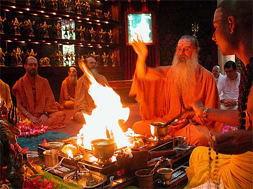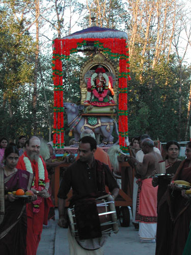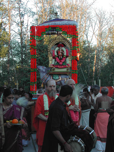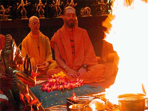Bodhinatha's seat has his wooden sandals, garlanded, taking his place at the homa until he returns in three days. The vibration of the temple builds during the rite and carries one off into deep meditation with ease.