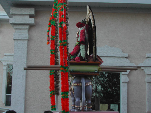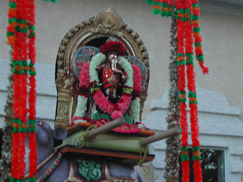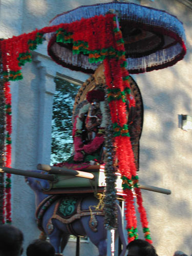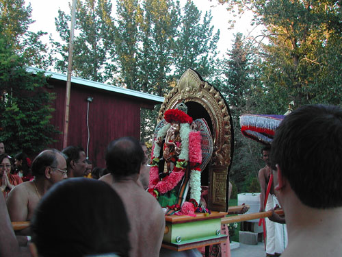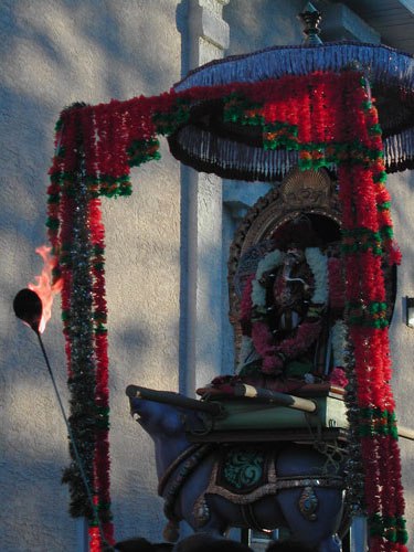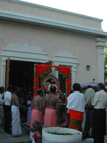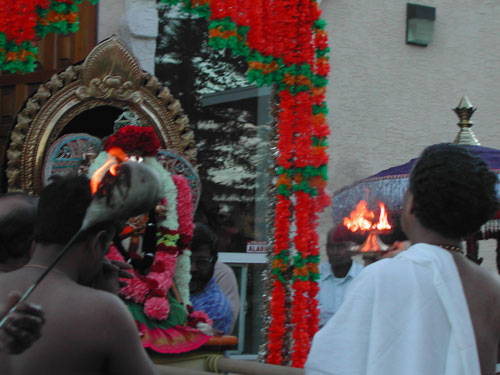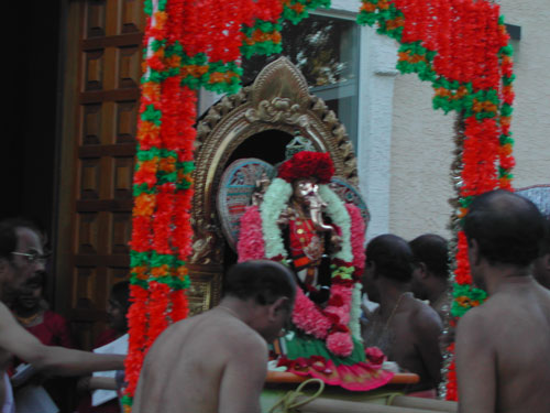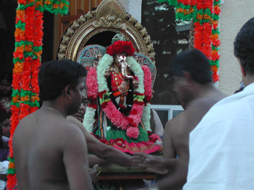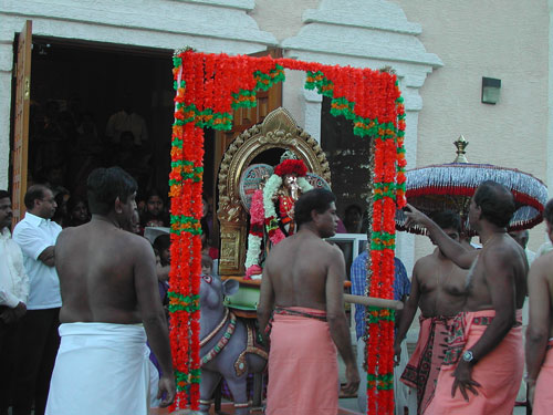 The parade deity is coming out of the temple after 3 hours of homa, abhishekam and pujas to all the shrines. Walking into the temple takes you right back to Sri Lanka.