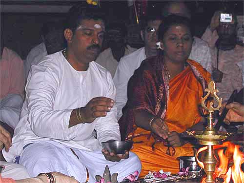 Hitesvara Saravan, Gunalan and Lalitha Ponniah take their Vrata Sishya vows.